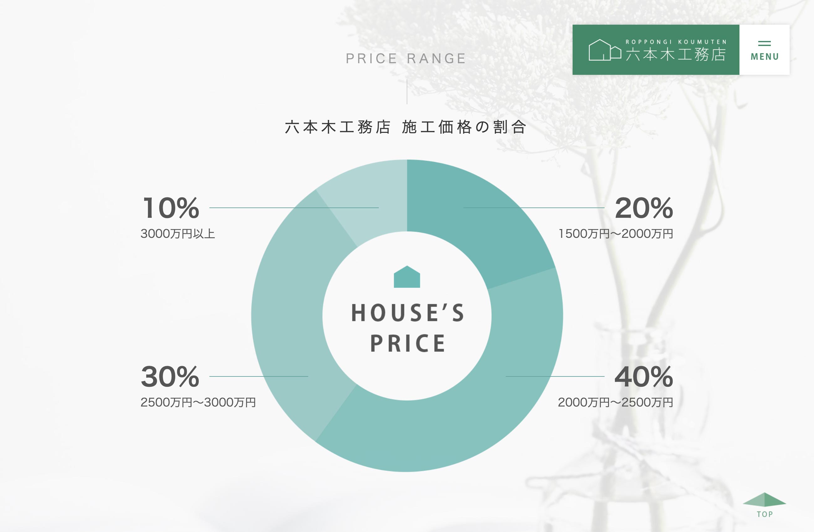 六本木工務店の家のページでは施工価格帯をグラフにしてお伝えすることで、お客様が依頼を検討しやすくなるよう工夫を盛り込んでいます。